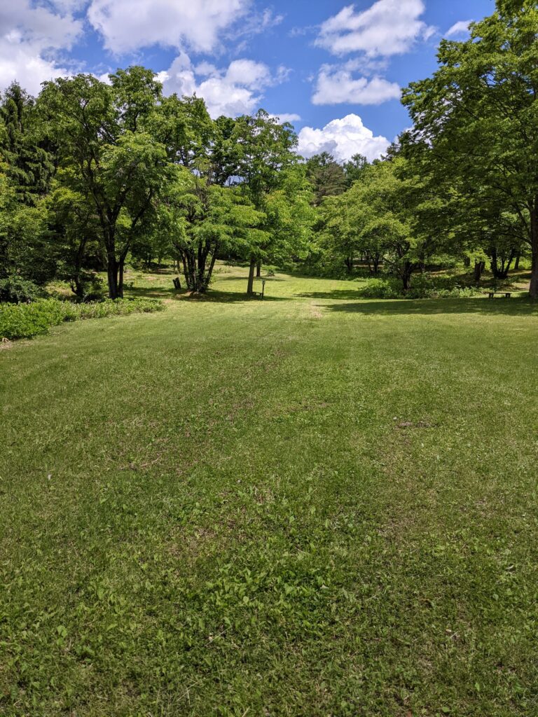 芝生が広がり、レンガの小路や小さな水辺、大きな木の木立に、辺りはたくさんの紫陽花