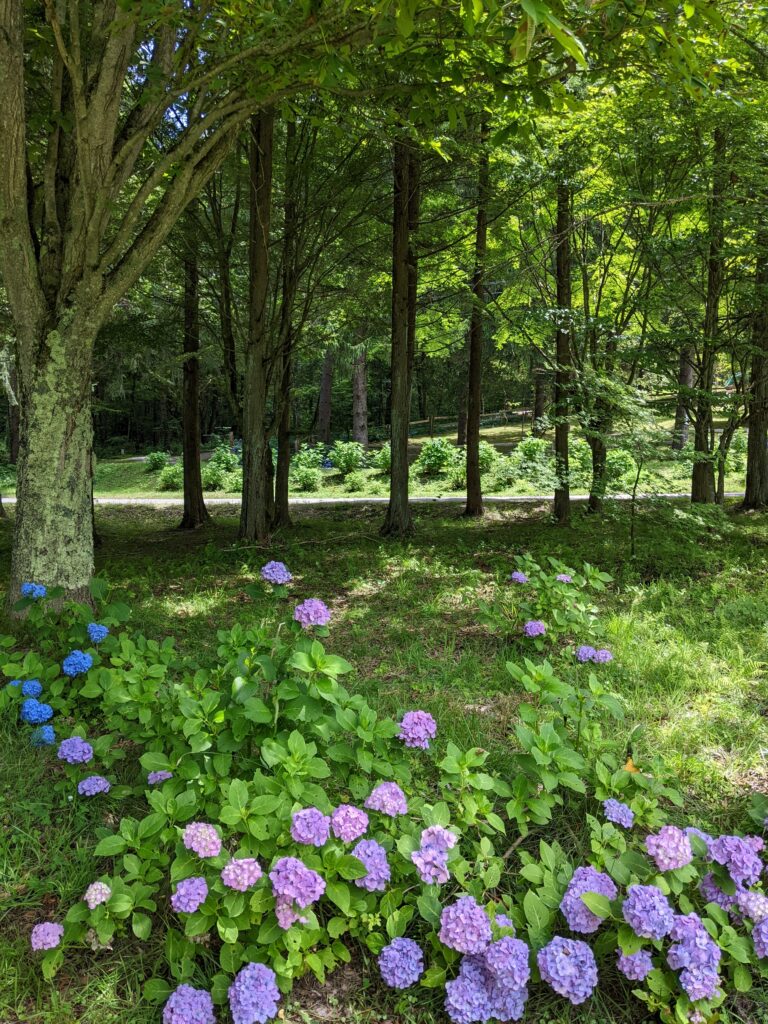 芝生が広がり、レンガの小路や小さな水辺、大きな木の木立に、辺りはたくさんの紫陽花